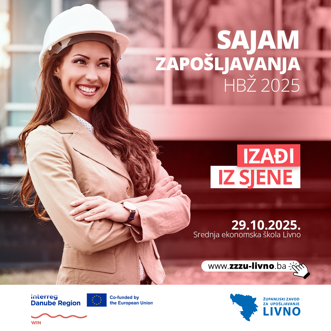 S veseljem Vas pozivamo da se pridružite Sajmu zapošljavanja Hercegbosanske županije 2025, koji će se održati 29. listopada 2025. godine u dvorani Srednje ekonomske škole u Livnu s početkom u 10:00 sati. Sajam se organizira u sklopu projekta WIN, pod sloganom: „IZAĐI IZ SJENE“.